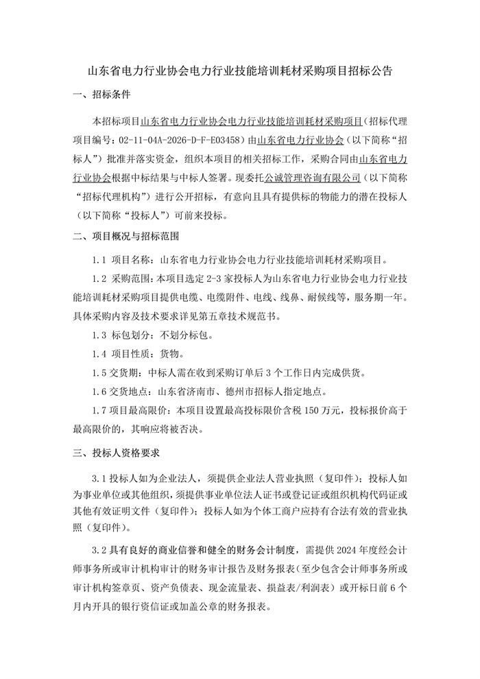 山东省电力行业协会电力行业技能培训耗材采购项目招标公告
