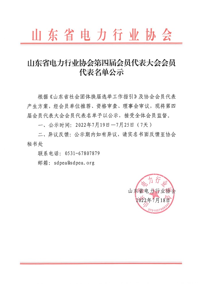 山东省电力行业协会第四届会员代表大会会员代表名单公示