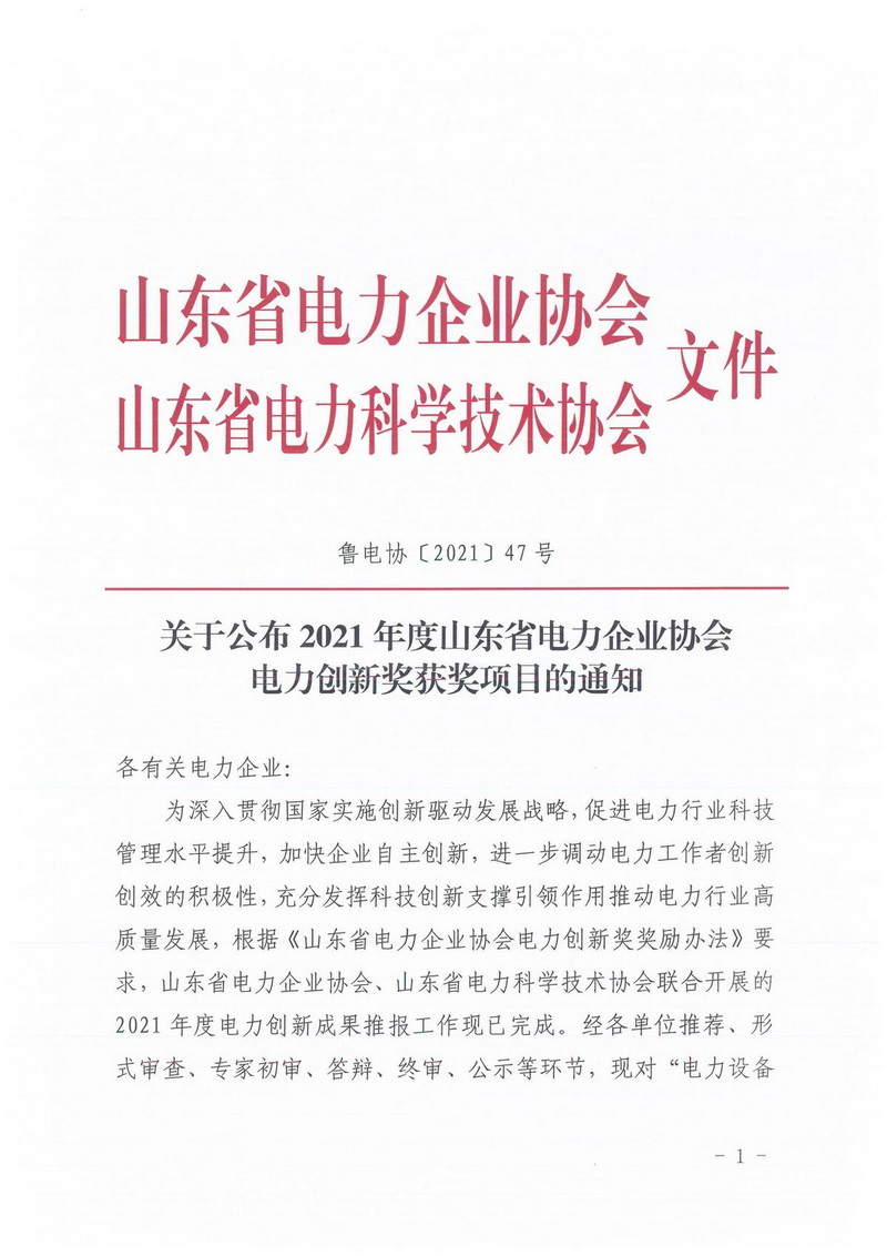 关于公布2021年度山东省电力企业协会电力创新奖获奖项目的通知