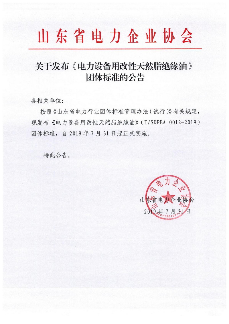 关于发布《电力设备用改性天然脂绝缘油》团体标准的公告