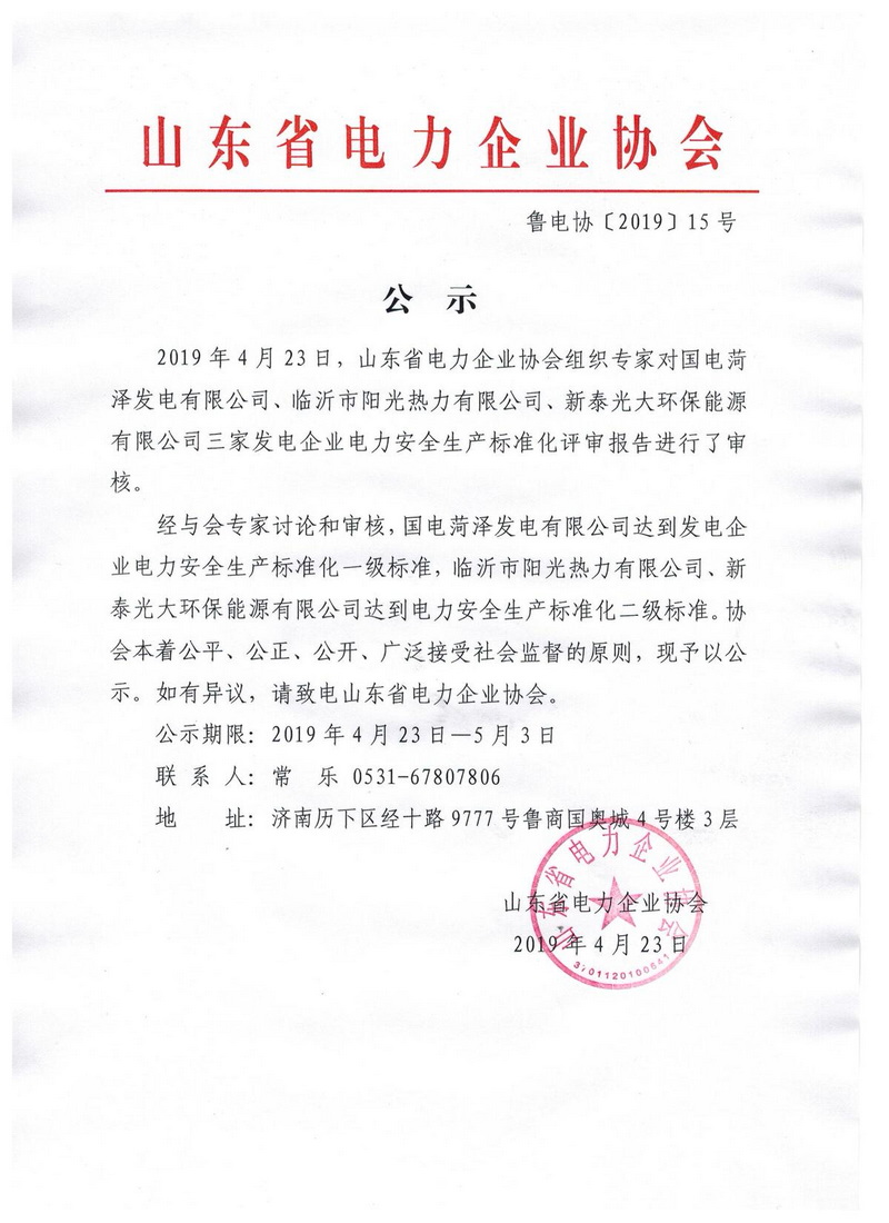 关于国电菏泽发电有限公司等三家企业电力安全生产标准化评审报告通过审核的公示