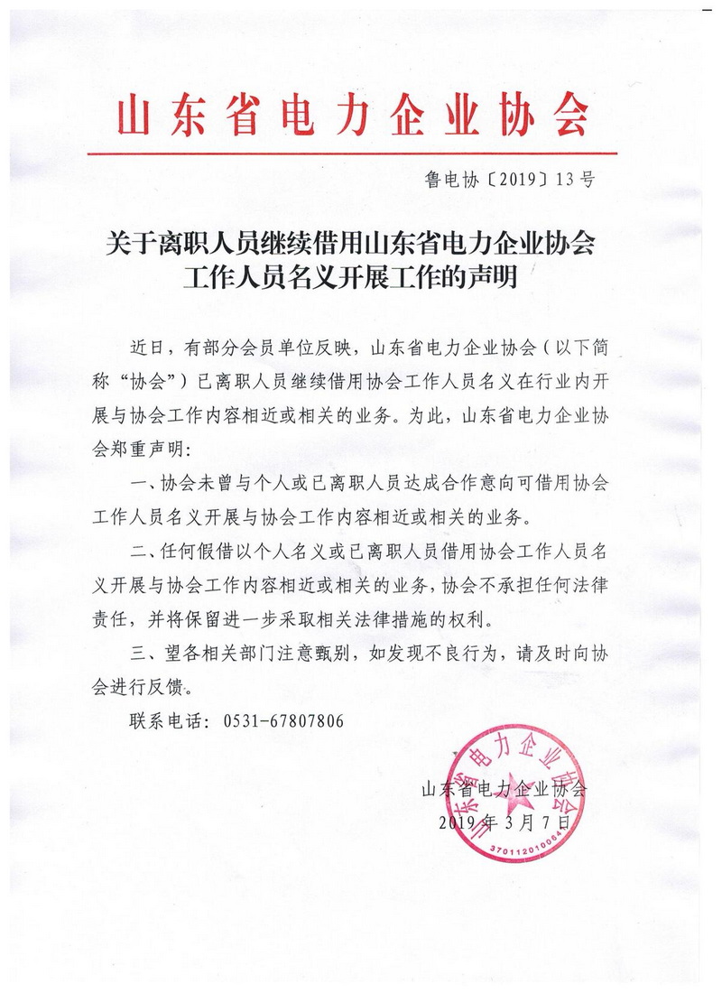 关于离职人员继续借用山东省电力企业协会工作人员名义开展工作的声明